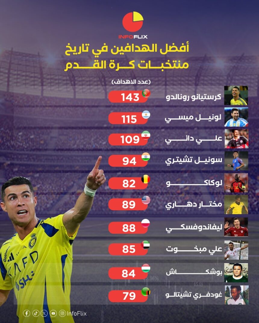 تُعَدّ قائمة هدّافي المنتخبات عبر التاريخ واحدة من أبرز المؤشرات التي تُظهر التأثير الحقيقي للاعبين على المستوى الدولي بعيدًا عن أنديتهم وارتباطاتهم المحلية. تعكس الأرقام الموجودة في الصورة مسيرة أساطير…