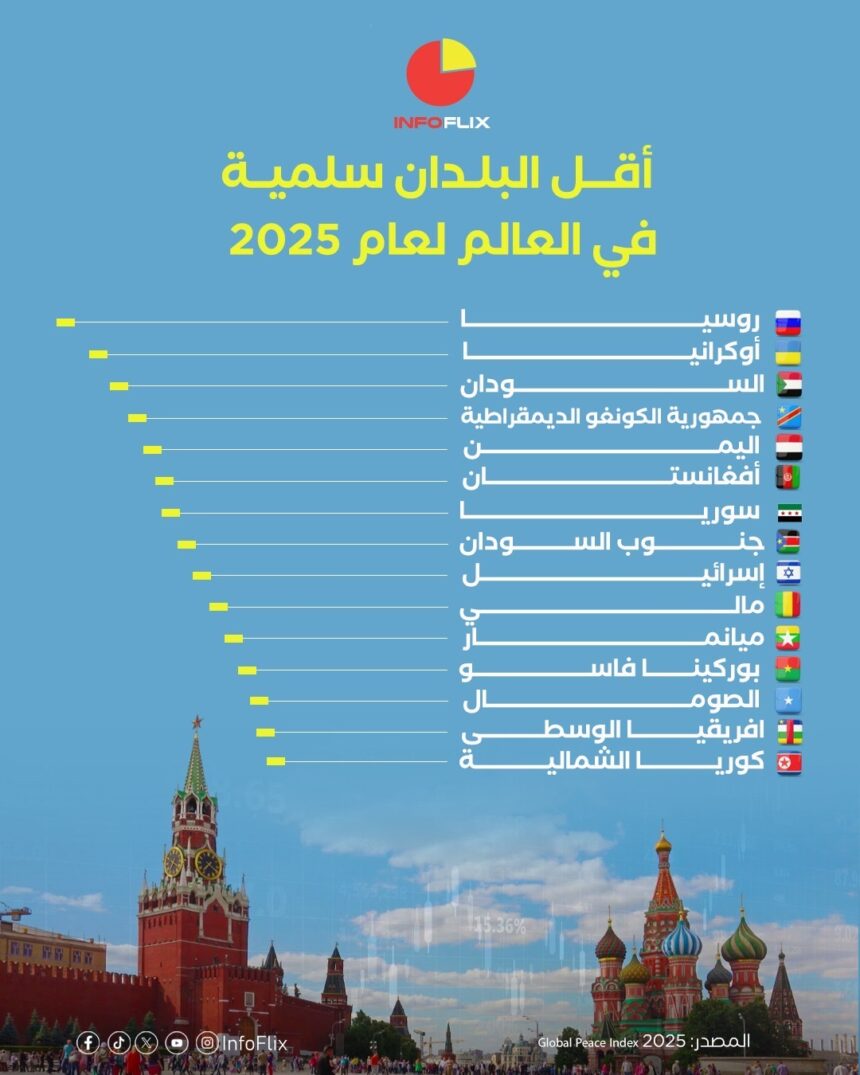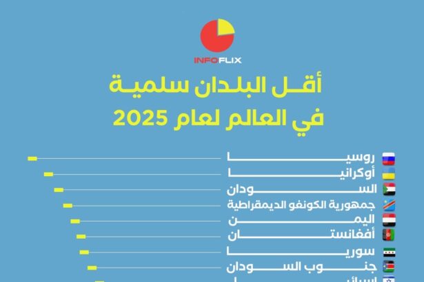كشف مؤشر السلام العالمي لعام 2025 عن قائمة الدول الأقل سلمية في العالم مستندًا إلى مجموعة من…