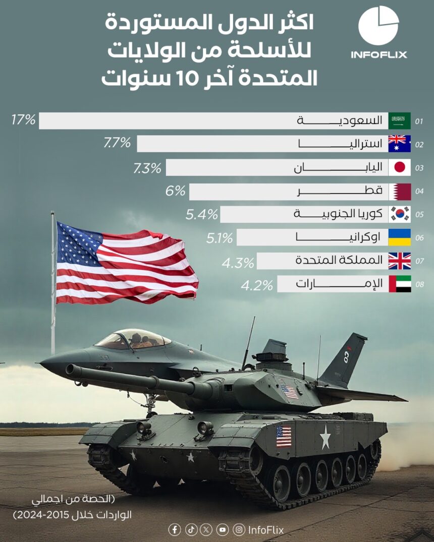 أكبر الدول المستوردة للأسلحة من الولايات المتحدة خلال السنوات العشر الأخيرة (2015–2024) وهو ما يسلّط…