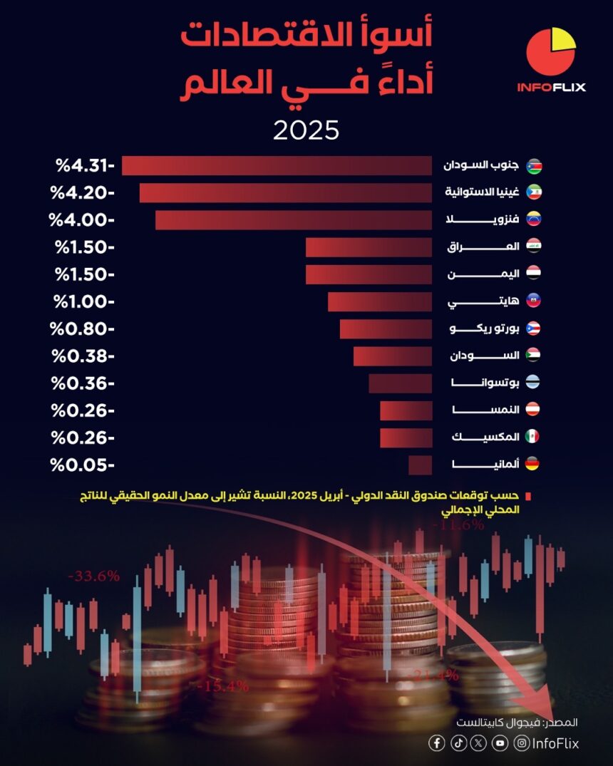 إنفوليكس > الإحصائيات العالمية > أسوأ الاقتصادات أداءً في العالم لعام 2025: