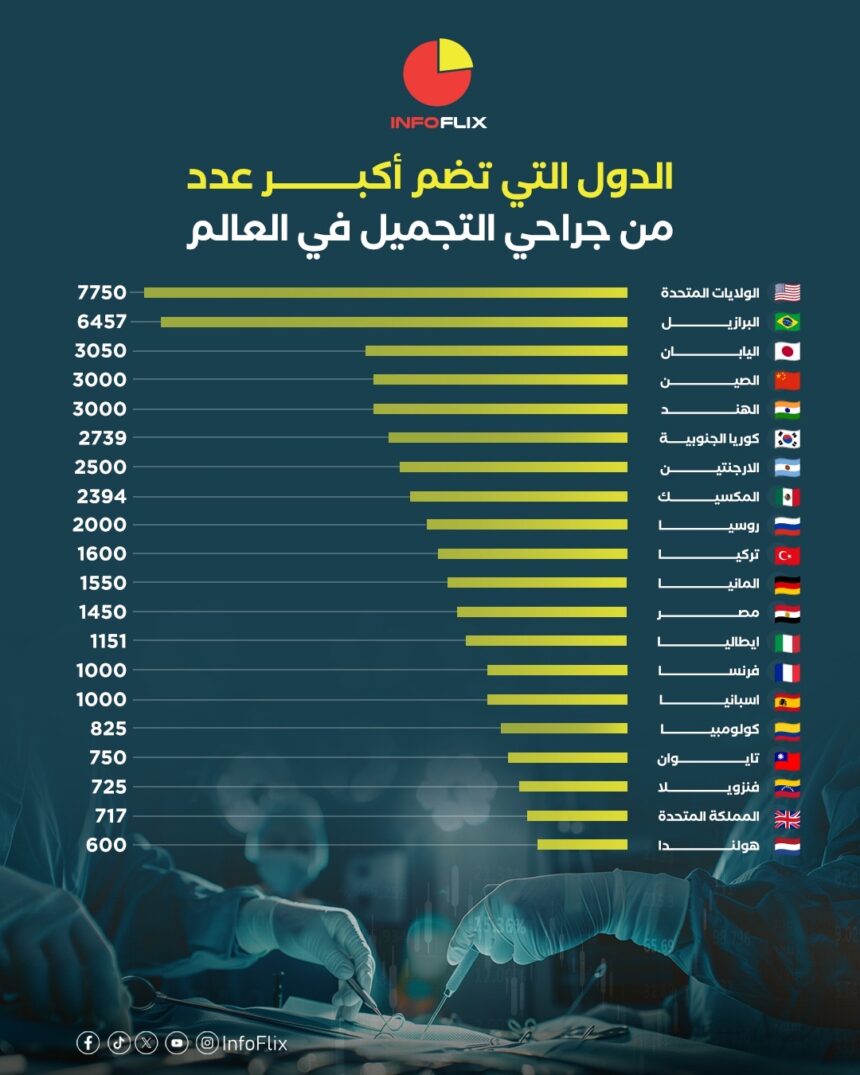 من اللافت وجود مصر ضمن القائمة بواقع 1450 جراح تجميل وهو ما يعكس تنامي الاهتمام بجراحات التجميل في العالم العربي. كما تحتل تركيا مكانة متقدمة بعدد 1600 جراح إذ أصبحت من أبرز الوجهات للسياحة العلاجية بفضل جودة الخدمات وتكلفة العمليات التنافسية.