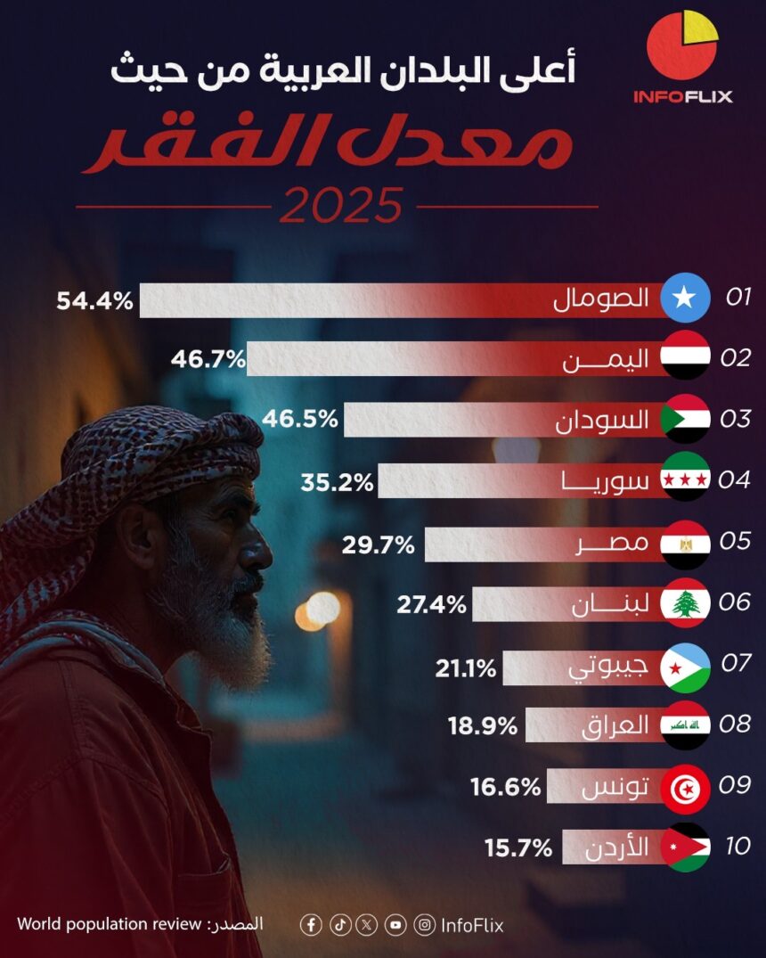 سجّل لبنان معدل فقر يبلغ 27.4% نتيجة الأزمة المالية التي عصفت بالبلاد منذ عام 2019، في حين بلغت النسبة في جيبوتي 21.1%، والعراق 18.9%، وهو ما يعكس تفاوتًا في نسب التعافي الاقتصادي رغم تحسن بعض المؤشرات في السنوات الأخيرة.