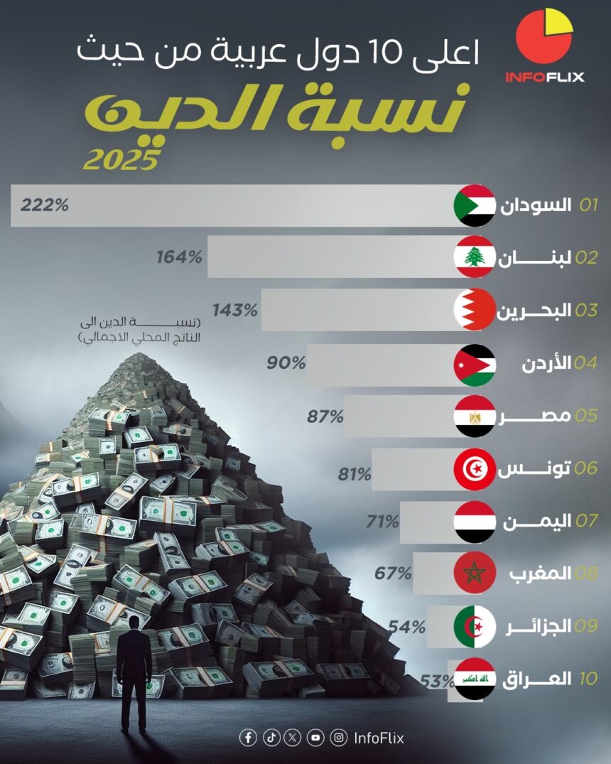 إنفوليكس > الإحصائيات العالمية > أعلى الدول العربية من حيث نسبة الدين للناتج المحلي 2025