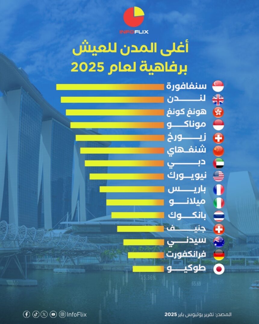 العالم العربي كان حاضرًا في القائمة من خلال مدينة دبي التي احتلت مركزًا متقدمًا بفضل بنيتها التحتية المتطورة وتنوعها الثقافي وسمعتها كوجهة فاخرة للعيش والعمل والسياحة.
