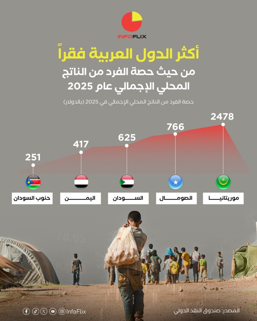 تشير التوقعات الاقتصادية الصادرة عن صندوق النقد الدولي إلى أن عدداً من الدول العربية ستظل تواجه تحديات كبيرة على صعيد مستويات الدخل الفردي في عام 2025. ويظهر في الصورة ترتيب الدول العربية الأكثر فقراً وفقاً لحصة الفرد من الناتج المحلي الإجمالي حيث تعكس الأرقام حالة التفاوت الاقتصادي بين الدول العربية وتكشف عن مدى ارتباط الوضع الاقتصادي بالاستقرار السياسي والاجتماعي.