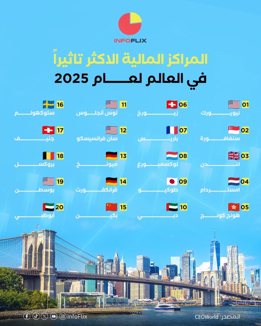 يقدّم هذا التصنيف ترتيبًا عالميًا لأبرز المراكز المالية التي تؤدي دورًا رئيسيًا في توجيه الاقتصاد العالمي خلال عام 2025 حيث تتنافس المدن الكبرى على استقطاب الاستثمارات واحتضان المؤسسات المصرفية وإدارة تدفقات رؤوس الأموال الدولية. ويبيّن هذا الترتيب أن النفوذ المالي أصبح موزعًا على عدة قارات مع استمرار حضور قوي للمراكز التقليدية وصعود ملحوظ لمدن جديدة.