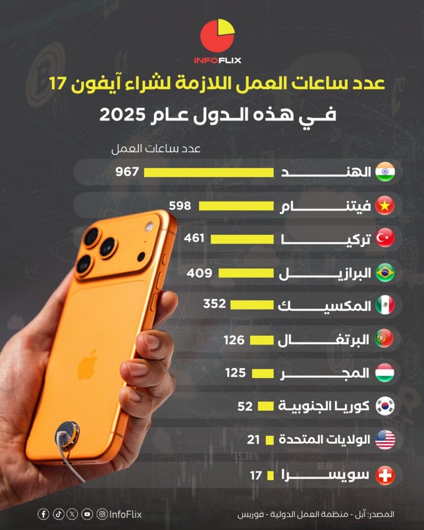 *المقارنة تكشف عن تباين صارخ بين الدول ففي حين يمكن لموظف سويسري شراء آيفون 17 بعد أقل من ثلاثة أيام من العمل يحتاج العامل في الهند إلى ما يقارب نصف عام من العمل المتواصل. هذا الاختلاف يعكس ليس فقط الفوارق في الدخل بل أيضًا السياسات الاقتصادية والقدرة الشرائية العامة في كل بلد.