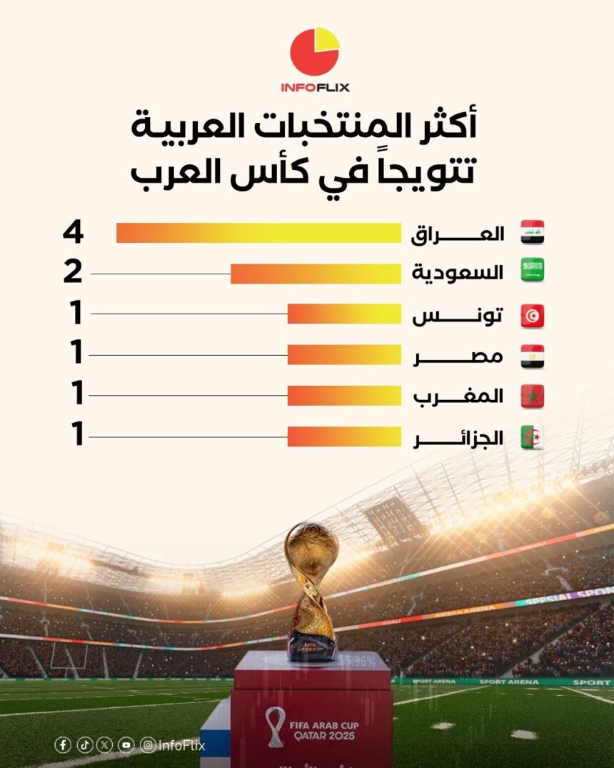 *تبرز هذه الإحصائية عمق المنافسة في كرة القدم العربية وتنوّع أبطالها عبر السنين مع وجود منتخبات ذات تاريخ طويل في البطولة وأخرى استطاعت أن تخطف اللقب في فترات مميزة من مسيرتها. ويظلّ كأس العرب ساحة مهمة تُظهر تطور الكرة العربية وتمنح جماهيرها فرصة متابعة صراع كروي يجمع بين التاريخ والطموح.