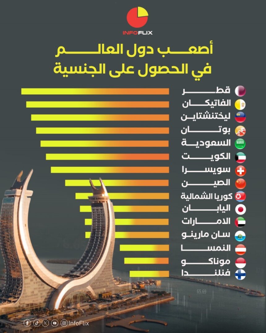 •قطر: تُعرف بسياساتها الصارمة جدًا في منح الجنسية حيث تُمنح في حالات نادرة جدًا ولأسباب استثنائية.