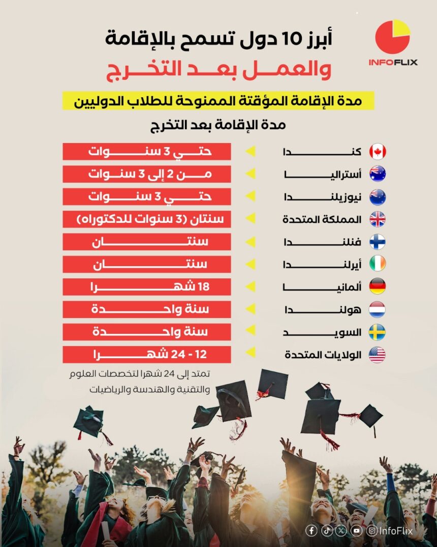 فيما يلي نظرة على أبرز 10 دول تمنح إقامة مؤقتة وفرص عمل بعد التخرج إلى جانب مدة الإقامة المسموح بها: