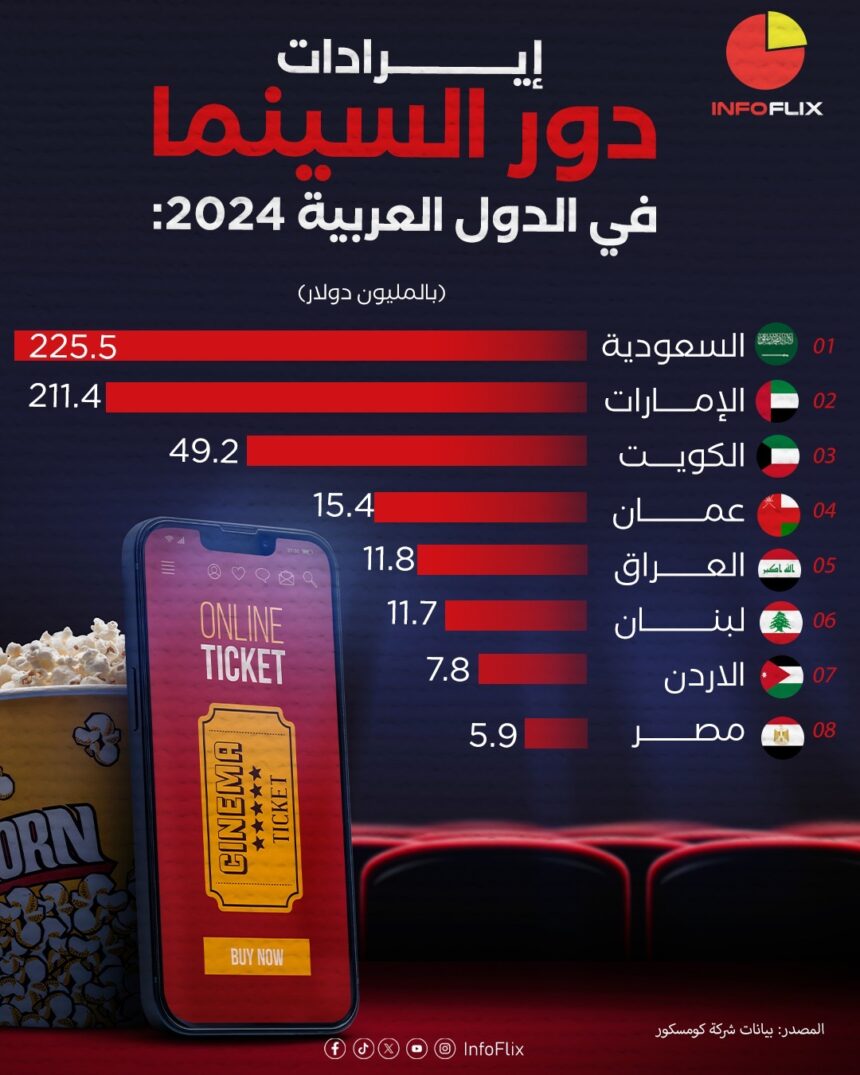 في المراتب التالية جاءت الكويت ثالثة بـ 49.2 مليون دولار تليها سلطنة عُمان بـ 15.4 مليون دولار ما يعكس اهتمامًا متزايدًا من الجمهور الخليجي بالفن السابع ودعمًا من الحكومات للقطاع الترفيهي كجزء من التنويع الاقتصادي.