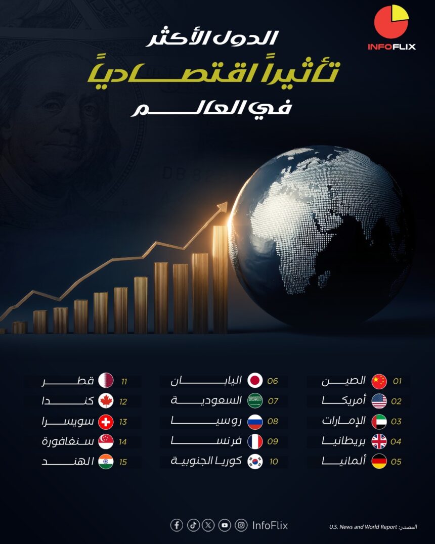 تتصدر الصين قائمة الدول الأكثر تأثيرًا اقتصاديًا بفضل قوتها الصناعية الضخمة واستثماراتها المستمرة في التكنولوجيا والبنية التحتية. تليها الولايات المتحدة الأمريكية التي تتميز ببيئة أعمال مرنة وريادة في مجالات الابتكار والتقنيات الحديثة خصوصًا في قطاعي التكنولوجيا والذكاء الاصطناعي.